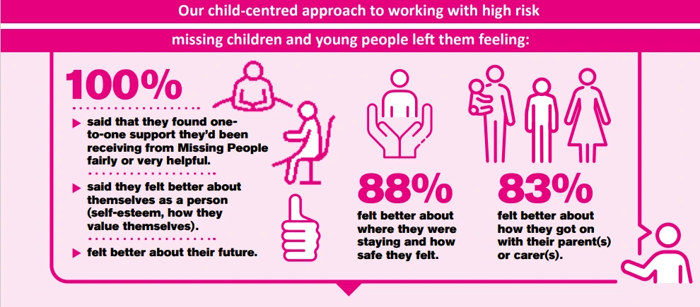 Our team can work with you to tailor a front-line operational service to meet the needs of your local missing children, young people and adults when they return. For adults, this could be a Prevention Interview (Safe and Well Check) service for immediate safeguarding and support on a person’s return. Our Return Home Interview, and 121 Intensive Support services have a proven track record in reducing missing episodes through effective safeguarding and support for the children and young people at highest risk of harm, including those who have been reported missing frequently. We have a person-centred approach, and our independent support workers can provide time and space to build trust, support disclosures and help access specialist support a missing person may need. All our services will work in partnership with local police, local authorities, and existing operational structures for preventing, responding to, and supporting local missing adults, children, young people and their families.