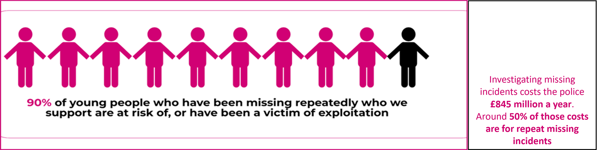 Missing People is launching a fresh approach to tackle local challenges around repeat missing and harm. We know that repeat missing incidents for adults account for more than 50% of all reports received by police forces in the UK, and 75% of reports for children and young people. Our research suggests that the relationship between missing and harm is significant: